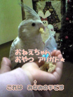やっぱり・・・はとぽっぽは見つかりませんでした(涙) なので はとぽっぽモドキの赤ちゃんで許していただきました(・(エ)・、) ううっ・・・力不足ですみません ★みなみんちの新しい家族★ 生後18日の赤ちゃんです。 もちろん・・・お預かりしています(涙) この寒い時期にこんなヒナヒナちゃん・・・ さすがのお気楽なわたしも緊張してしまいますぅ。 温度管理や体調管理が大変(・(エ)・、) 無事大きくなるまで責任重大な任務です。 食べたご飯がきちんと消化しているか・・・ そしてその消化に合わせて 次のご飯を食べさせなければいけない (意外とお世話が大変なのです) だけど・・・見ているだけで癒されてしまいます♪ いいねぇーーーーやっぱインコちゃんはいいねぇーー。 こんな小さな赤ちゃんでも ご飯を食べさせてくれたり お部屋のお掃除してくれるのが誰なのか分かってるんですよぉ(〃▽〃) わたしを見るとキューと鳴きながら近づいて来てくれます (すでに乳母バカ炸裂!! お別れの日を想像するだけでもぉ・・・淋しくなります(T(エ)T) ) そこで問題です(≧∇≦)b この仔は誰でしょう?? おねえちゃん・・・これおいちいね クチャクチャ モグモグ おやつを食べる可愛い子ちゃん♪ 鷹のような素敵な模様です。 トムゾウくんでも トムくん2でも チキチキさんでも ありません(一目瞭然・・当たり前ww) じゃーーーーん♪たまらなくなってお迎えしてしまいましたよぉぉぉぉぉぉぉ。 福岡から飛行機に乗って我が家へきてくれました♪ うちの新しい家族がまた・・・・性懲りもなく増えました♪♪ もぉ・・・・みーくんがデレデレなんですぅ 嫁も子供もそっちのけで この仔のトリコ(爆) ・・・・・というわけで わたしは忙しい! I am busy! 中国語では我很忙!! いろんな言葉で 忙しいをアピールしてみました(爆) (スペルが合っているか・・・・自信がありませんが・・・・(>▽<;; ) 忙しいと言えばチキチキさん!! 暴れてたのか?お部屋(鳥かご)の金網に足をひっかけて 捻挫です 止まり木にも止まれません(・(エ)・、) 赤ちゃんハウスに逆戻りです(涙) 画像では珍しく立って寝ているけど・・・ 普段はワンワンや猫ちゃんみたいに ゴローーンと寝転がって爆睡している(>▽<;; 起きててもゴロゴロ転がってますから! アンタ・・・そんなに油断してていいんか!みたいな(笑) 野生ならとっくに食われています! このチキチキハウスのお掃除が大変なんです 汚れた場所で寝転がられたら たまりません! 一日何回も敷物を変えてあげないと・・・・(o>(ェ)<;a アセアセ しかし・・・どんなに誠心誠意尽くしても チキチキさんとは親睦を はかれません(; (エ) ;) お掃除途中でチキチキ怒り わたしのセーターの袖口に噛み付きブラ下がってたりしますぅ ・・・・アンタ 態度がLL過ぎーーー! 今度噛んだら ホンマに知りまへんでーーーー! (毎回こう言って脅しているが・・・一向に改心しない強情なチキチキさんなのです) 年末が近づいているというのに・・・・・家のお掃除はおそろかで 小鳥と戯れているバカ嫁です(爆) PR |